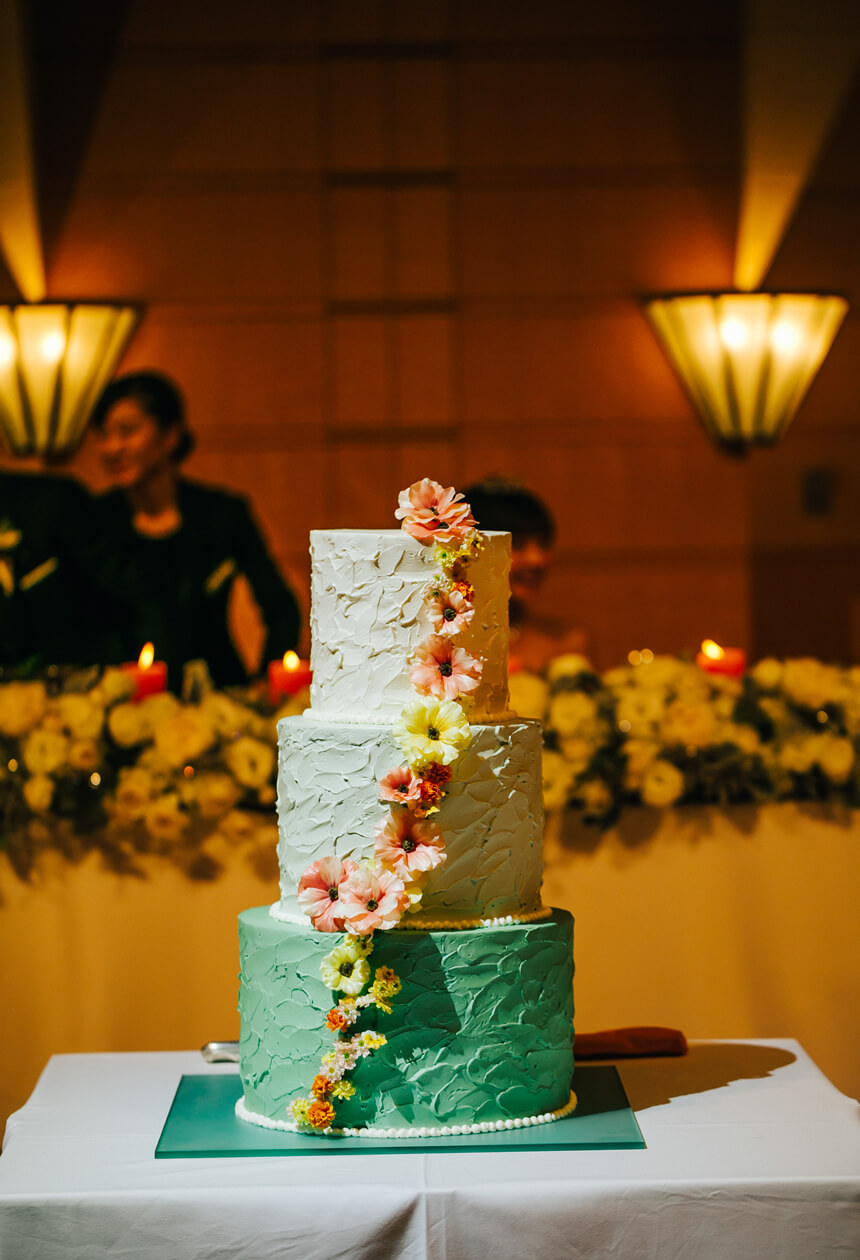 乾杯後は、美味しい食事に舌鼓しながら、ゲストの会話を楽しみウエディングケーキ入刀へ。